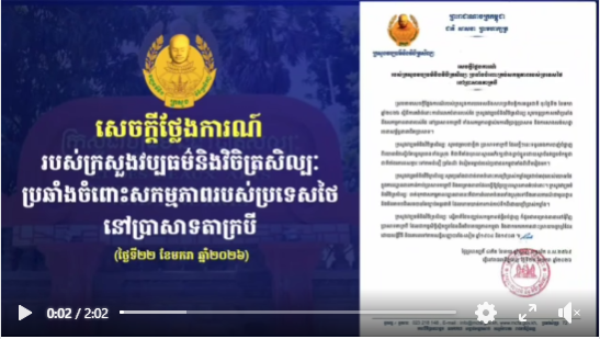 ថ្ងៃនេះ អ្នកនាំពាក្យរាជរដ្ឋាភិបាលកម្ពុជា សូមជម្រាបជូនសាធារណជនជាតិនិងអន្តរជាតិជា្របអំពីការតវ៉ាយ៉ាងខ្លាំងរបស់កម្ពុជាប្រឆាំងនឹងសកម្មភាពរបស់កម្លាំងប្រដាប់អាវុធថៃ៖