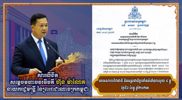 សម្តេចមហាបវរធិបតី ហ៊ុន ម៉ាណែត នាយករដ្ឋមន្ត្រីនៃកម្ពុជា នៅថ្ងៃទី០៦ ខែធ្នូ ឆ្នាំ២០២៣នេះ បានចេញសារលិខិតអបអរសាទរដល់ ទិវាជាតិ និងអន្តរជាតិប្រឆាំងអំពើពុករលួយ ៩ធ្នូ