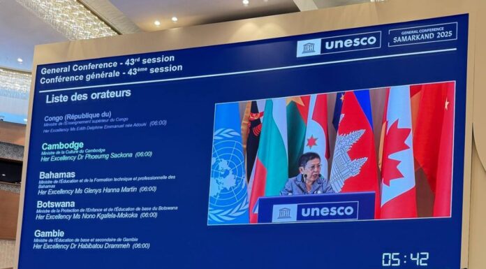 នៅទីក្រុងសាម៉ាកាន់ ប្រទេសអ៊ូសបេគីស្តង់ នារសៀលថ្ងៃទី០៣ ខែវិច្ឆិកា ឆ្នាំ២០២៥ លោកជំទាវបណ្ឌិតសភាចារ្យ ភឿង សកុណា រដ្ឋមន្រ្តីក្រសួងវប្បធម៌ និងវិចិត្រសិល្បៈ អញ្ជើញថ្លែង