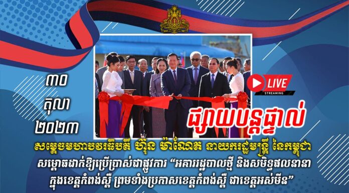 សម្ដេចមហាបវរធិបតី ហ៊ុន ម៉ាណែត នាយករដ្ឋមន្ដ្រីនៃកម្ពុជា នៅព្រឹកថ្ងៃទី៣០ ខែតុលា ឆ្នាំ២០២៣នេះ អញ្ជើញជាអធិបតីភាពពិធីសម្ពោធដាក់ឲ្យប្រើប្រាស់អគាររដ្ឋបាលថ្មី