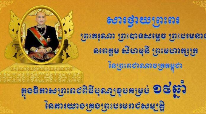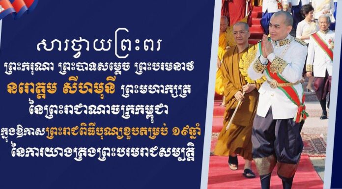 ក្នុងឱកាសព្រះរាជពិធីដ៏ឧត្ដុង្គឧត្ដមប្រសើរថ្លៃថ្លា នៃព្រះរាជពិធីបុណ្យខួបលើកទី១៩ នៃការយាងគ្រងព្រះបរមសិរីរាជសម្បត្តិរបស់ ព្រះករុណា ព្រះបាទសម្តេច ព្រះបរមនាថ នរោត្តម សីហមុនី