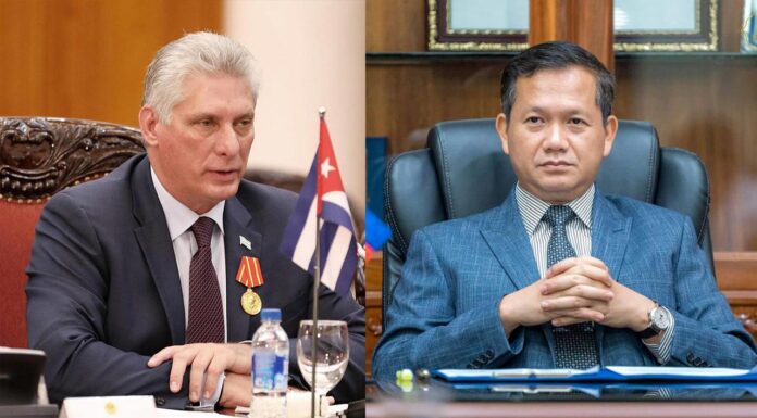 សម្តេចមហាបវរធិបតី ហ៊ុន ម៉ាណែត នាយករដ្ឋមន្ត្រីកម្ពុជា និងលោក មីហ្គែល ឌីយ៉ាស-ខាណែល ប៊ឺមូដេស (Miguel Diaz-Canel Bermudez) ប្រធានាធិបតីគុយបា