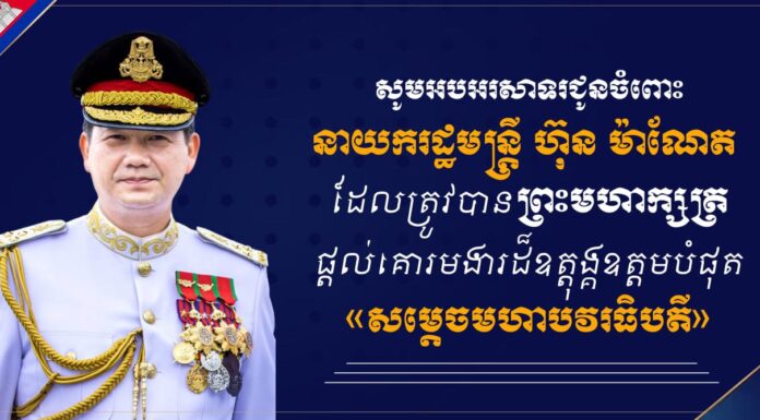 ព្រះករុណា ព្រះបាទ សម្តេចព្រះបរមនាថ នរោត្តម សីហមុនី ព្រះមហាក្សត្រនៃកម្ពុជា បានចេញព្រះរាជក្រឹត្យ ត្រាស់បង្គាប់ផ្តល់គោរមងារដ៏ឧត្តុង្គឧត្តមខ្ពង់ខ្ពស់បំផុត ជូននាយករដ្ឋមន្រ្តី ហ៊ុន ម៉ាណែត ជា «សម្តេចមហាបវរធិបតី»។