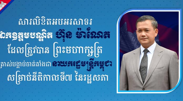 ឯកឧត្តមបណ្ឌិត ហ៊ុន ម៉ាណែត បានថ្លែងអំណរគុណ ចំពោះសារអបអរសាទរទាំងឡាយ ក្រោយពីឯកឧត្តមត្រូវបានព្រះមហាក្សត្រ ត្រាស់បង្គាប់ចាត់តាំង ជានាយករដ្ឋមន្ត្រីនៃកម្ពុជា
