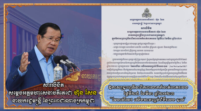 សារលិខិតសម្តេចអគ្គមហាសេនាបតីតេជោ ហ៊ុន សែន នាយករដ្ឋមន្រ្តីនៃព្រះរាជាណាចក្រកម្ពុជា ក្នុងឱកាសប្រារព្ធទិវាពិភពលោកកំចាត់រោគរបេង ថ្ងៃទី២៤ ខែមីនា ឆ្នាំ២០២៣