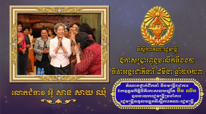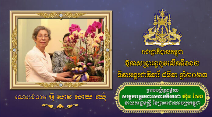 សារលិខិតជូនពររបស់ សម្តេចអគ្គមហាសេនាបតីតេជោ ហ៊ុន សែន នាយករដ្ឋមន្រ្តី នៃព្រះរាជាណាចក្រកម្ពុជា ជូនលោកជំទាវ អ៊ូ សាន សាយ ឈុំ ក្នុងឱកាសប្រារព្ធខួបលើកទី១១២ ទិវាអន្តរជាតិនារី ៨មីនា ឆ្នាំ២០២៣