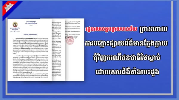 រដ្ឋបាលខេត្តបន្ទាយមានជ័យ ចេញលិខិតបដិសេធ និងចោលចោលទាំងស្រុង ចំពោះការចុះផ្សាយព័ត៌មានមិនពិត មានលក្ខណៈញុះញង់ឱ្យមានការរើសអើង ប្រកាន់ពូជសាសន៍