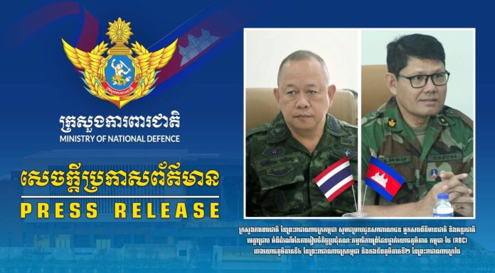 ក្រសួងការពារជាតិ នៃព្រះរាជាណាចក្រកម្ពុជា សូមជម្រាបជូនសាធារណជន អ្នកសារព័ត៌មានជាតិ និងអន្តរជាតិមេត្តាជ្រាប អំពីដំណើរនៃការរៀបចំកិច្ចប្រជុំគណៈកម្មាធិការព្រំដែនថ្នាក់យោធភូមិភាគ កម្ពុជា-ថៃ (RBC)