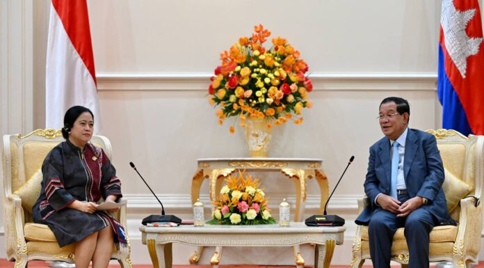 នៅវិមានសន្តិភាព នាព្រឹកថ្ងៃទី២៤ ខែវិច្ឆិកា ឆ្នាំ២០២២នេះ សម្ដេចអគ្គមហាសេនាបតីតេជោ ហ៊ុន សែន នាយករដ្ឋមន្ត្រី នៃព្រះរាជាណាចក្រកម្ពុជា បានអញ្ជេីញជួបពិភាក្សាការងារជាមួយ លោកជំទាវបណ្ឌិត ពាន់ ម៉ាហារ៉ានី(PUAN MAHARANI) ប្រធានរដ្ឋសភា នៃសាធារណរដ្ឋឥណ្ឌូនេស៉ី។