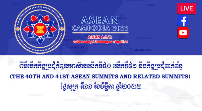 នៅព្រឹកថ្ងៃសុក្រ ទី១១ ខែវិច្ឆិកា ឆ្នាំ២០២២នេះ សម្តេចតេជោ ហ៊ុន សែន នាយករដ្ឋមន្ត្រីកម្ពុជា និងជាប្រធានអាស៊ាន ក៏ដូចជាមេដឹកនាំកំពូល របស់អាស៊ាន នឹងអញ្ជើញបើកកិច្ចប្រជុំកំពូលអាស៊ានលើកទី៤០ លើកទី៤១ និងកិច្ចប្រជុំពាក់ព័ន្ធ ជាផ្លូវការ។ ពិធីដ៏មហោឡារិកនេះនឹងប្រព្រឹត្តទៅ នៅសណ្ឋាគារសុខាភ្នំពេញ