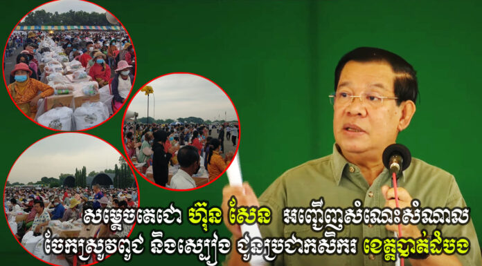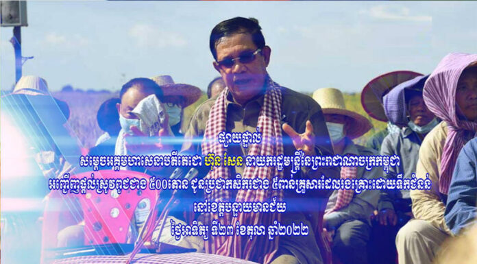 សម្តេចអគ្គមហាសេនាបតីតេជោ ហ៊ុន សែន នាយករដ្ឋមន្ត្រី នៃព្រះរាជាណាចក្រកម្ពុជា បានអញ្ជើញផ្តល់ស្រូវពូជជាង ៥០០តោន ជូនប្រជាកសិករជាង ៥ពាន់គ្រួសារ ដែលរងគ្រោះដោយទឹកជំនន់ នៅខេត្តបន្ទាយមានជ័យ។