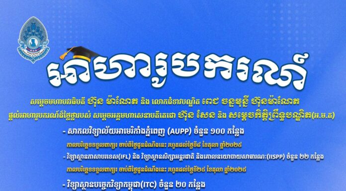 សាកលវិទ្យាល័យអាមេរិកាំងភ្នំពេញ (AUPP) ថ្នាក់បរិញ្ញាបត្រ ជំនាញបច្ចេកវិទ្យាឌីជីថល សម្រាប់ឆ្នាំសិក្សា ២០២៥-២០២៦ ចំនួន ១០០ កន្លែង ដោយឆ្លងកាត់ការប្រឡង។ កាលបរិច្ឆេទទទួលពាក្យ៖ ចាប់ពីថ្ងៃជូនដំណឹងនេះ