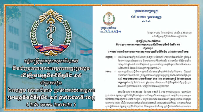 ក្រសួងសុខាភិបាល នៅថ្ងៃទី២៦ ខែមេសា ឆ្នាំ២០២២នេះ បានចេញលិខិតមួយ ប្រាប់ដល់អភិបាលរាជធានីខេត្ត អំពីការលើកលែងកាតព្វកិច្ចពាក់ម៉ាស់ នៅតាមទីសាធារណៈទូទាំងប្រទេស និងការចូលរួមចាក់វ៉ាក់សាំងកូវីដ-១៩ ដូសទី៣