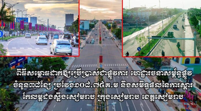 នៅព្រឹកថ្ងៃចន្ទ ទី០៤ ខែមេសា ឆ្នាំ២០២២នេះ សម្តេចអគ្គមហាសេនាបតីតេជោ ហ៊ុន សែននាយករដ្ឋមន្ត្រីនៃព្រះរាជាណាចក្រកម្ពុជា អញ្ជើញសម្ពោធដាក់ឱ្យប្រើប្រាស់ផ្លូវចំនួន៣៨ខ្សែ ព្រមទាំងហេដ្ឋារចនាសម្ព័ន្ធរូបវន្តមួយចំនួនទៀតក្នុងក្រុងសៀមរាប