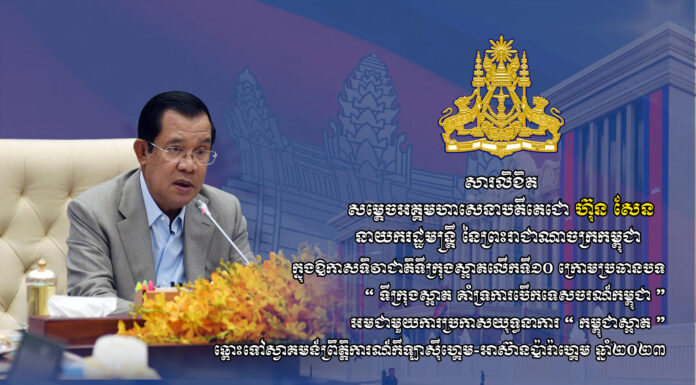 សម្តេចអគ្គមហាសេនាបតីតេជោ ហ៊ុន សែន នាយករដ្ឋមន្ត្រី នៃព្រះរាជាណាចក្រកម្ពុជា ក្នុងឱកាសទិវាជាតិទីក្រុងស្អាតលើកទី១០ ក្រោមប្រធានបទ “ ទីក្រុងស្អាត គាំទ្រការបើកទេសចរណ៍កម្ពុជា ” អមជាមួយការប្រកាសយុទ្ធនាការ “ កម្ពុជាស្អាត ” ឆ្ពោះទៅស្វាគមន៍ព្រឹត្តិការណ៍កីឡាស៊ីហ្គេម-អាស៊ានប៉ារ៉ាហ្គេម ឆ្នាំ២០២៣