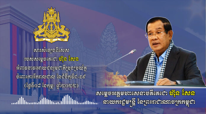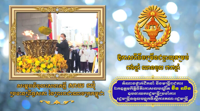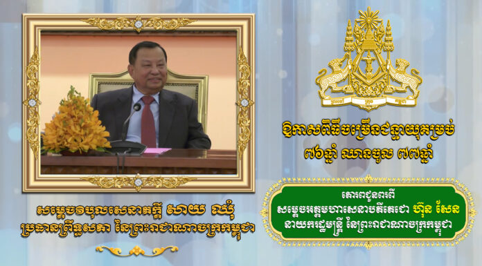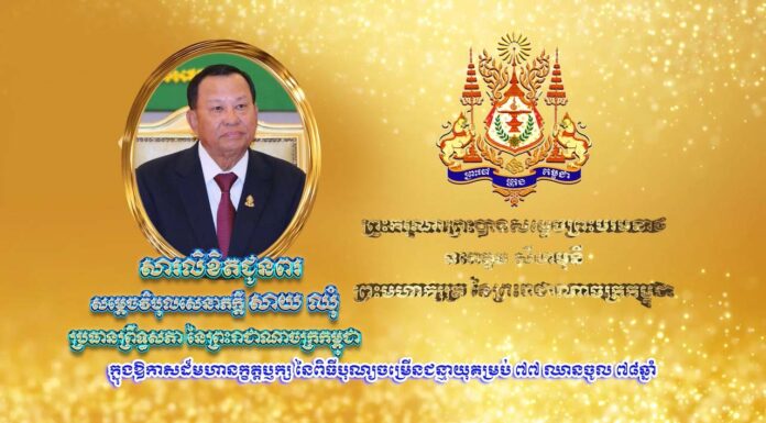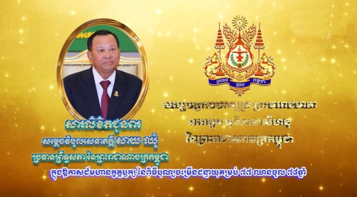សម្តេចអគ្គមហាសេនាបតីតេជោ ហ៊ុន សែន នាយករដ្ឋមន្រ្តី នៃព្រះរាជាណាចក្រកម្ពុជា ផ្ញើលិខិតជូនពរដល់ សម្តេចវិបុលសេនាភក្តី សាយ ឈុំ ប្រធានព្រឹទ្ធសភានៃព្រះរាជាណាចក្រកម្ពុជា នៅក្នុងឱកាសខួបចម្រើនជន្មាយុ គម្រប់៧៧ ឈានចូល៧៨ឆ្នាំ