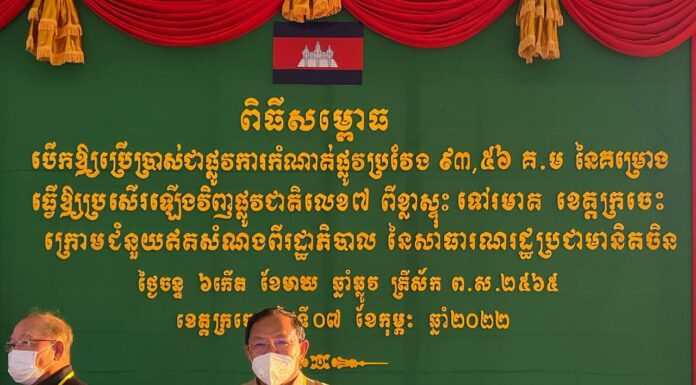 ថ្ងៃនេះ ខ្ញុំមានការរីករាយ ដែលបានរួមជាមួយឯកឧត្តម វ៉ាង វិនធាន ឯកឧត្តម លោកជំទាវ អស់លោក លោកស្រី និងបងប្អូនជនរួមជាតិ ដើម្បីសម្ពោធដាក់ឱ្យប្រើប្រាស់នូវផ្លូវជាតិលេខ ៧ ប្រវែង(ជាង) ៩៣ គីឡូម៉ែត្រ ពីរង្វង់មូលខ្លាស្ទុះ ទៅដល់ឃុំរមាត ខេត្តក្រចេះ។