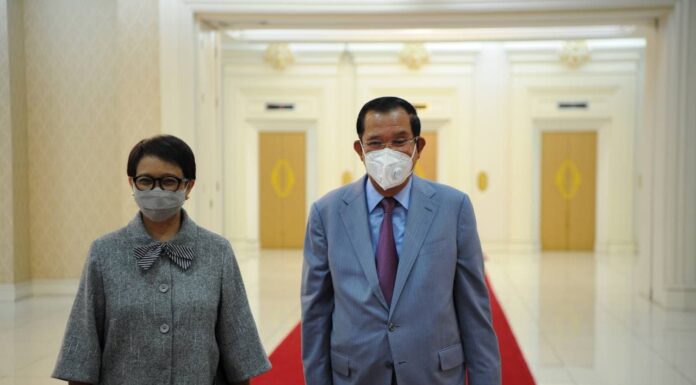 នៅវិមានសន្តិភាព ថ្ងៃទី១ ខែធ្នូ ឆ្នាំ២០២១នេះ សម្ដេចអគ្គមហាសេនាបតីេតជោ ហ៊ុន សែន នាយករដ្ឋមន្ត្រីនៃព្រះរាជាណាចក្រកម្ពុជា បានអនុញ្ញាតឲ្យលោកជំទាវ រីណូ ម៉ាស៊ូឌី រដ្ឋមន្ត្រីការបរទេសនៃសាធារណរដ្ឋឥណ្ឌូណេស៊ី ចូលជួបសម្ដែងការគួរសមនិងពិភាក្សាការងារ។