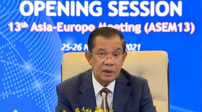 នៅក្នុងពិធីបិទកិច្ចប្រជុំពេញអង្គទី១ នារសៀលថ្ងៃទី២៥ ខែវិច្ឆិកា ឆ្នាំ២០២១ សម្តេចអគ្គមហាសេនាបតីតេជោ ហ៊ុន សែន នាយករដ្ឋមន្ត្រី នៃព្រះរាជាណាចក្រកម្ពុជា ក្នុងនាមជាម្ចាស់ផ្ទះនៃកិច្ចប្រជុំអាស៊ីអឺរ៉ុបលើកទី១៣(ASEM-13)