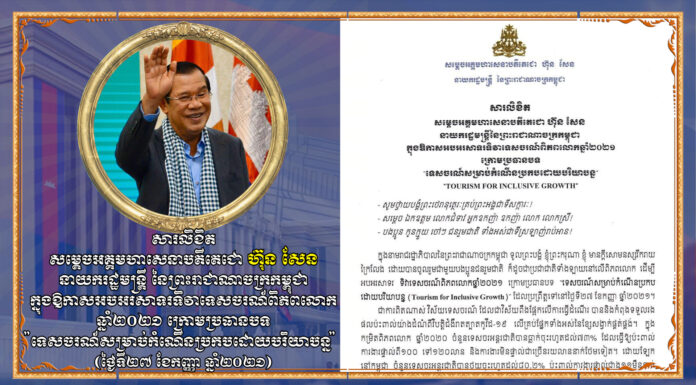 សារលិខិតសម្តេចអគ្គមហាសេនាបតីតេជោ ហ៊ុន សែន នាយករដ្ឋមន្រ្តី នៃព្រះរាជាណាចក្រកម្ពុជា ក្នុងឱកាសអបអរសាទរទិវាទេសចរណ៍ពិភពលោកឆ្នាំ២០២១ ក្រោមប្រធានបទ «ទេសចរណ៍សម្រាប់កំណើនប្រកបដោយបរិយាបន្ន»