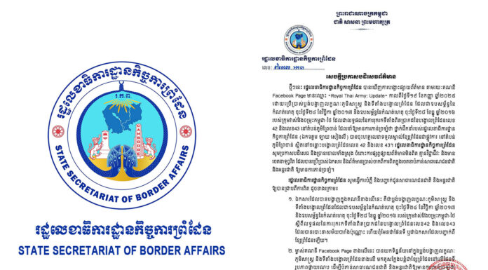 សេចក្តីប្រកាសបដិសេធព័ត៌មានរបស់ រដ្ឋលេខាធិការដ្ឋានកិច្ចការព្រំដែន ចំពោះព័ត៌មានមិនពិត ដែលផ្សាយដោយទំព័រហ្វេសប៊ុកឈ្មោះ “Royal Thai Army: Update”