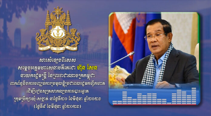 សារសំឡេងពិសេស សម្តេចអគ្គមហាសេនាបតីតេជោ ហ៊ុន សែន នាយករដ្ឋមន្រ្តី នៃព្រះរាជាណាចក្រកម្ពុជា ពាក់ព័ន្ធនឹងការបញ្ឈប់ការប្រមូលផ្តុំប្រជាពលរដ្ឋមកហ្វឹកហាត់ ដើម្បីរៀនសូត្រសាកល្បងការបោះឆ្នោត ក្រុមប្រឹក្សាឃុំ-សង្កាត់ នាថ្ងៃទី២០ ខែមិថុនា ឆ្នាំ២០២១ (ថ្ងៃទី៩ ខែមិថុនា ឆ្នាំ២០២១)