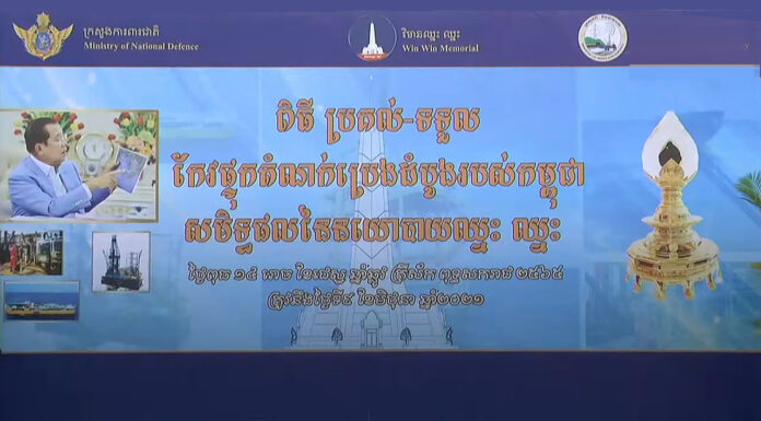 ពិធីប្រគល់ ទទួលកែវផ្ទុកដំណក់ប្រេងដំបូងរបស់កម្ពុជា ក្រោមអធិបតីភាពសម្តេចពិជ័យសេនា ទៀ បាញ់ ឧបនាយករដ្ឋមន្ត្រីក្រសួងការពារជាតិ និងជាប្រធានគណៈកម្មការសាងសង់វិមានឈ្នះឈ្នះ ថ្ងៃទី៩ ខែមិថុនា ឆ្នាំ២០២១