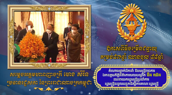 សារលិខិតជូនពរ ឯកឧត្តមកិត្តិនីតិកោសលបណ្ឌិត ប៊ិន ឈិន ឧបនាយករដ្ឋមន្រ្តីប្រចាំការ ជូនសម្តេចអគ្គមហាពញាចក្រី ហេង សំរិន ប្រធានរដ្ឋសភា នៃព្រះរាជាណាចក្រកម្ពុជា ក្នុងឱកាសពិធីចម្រើនជន្មាយុគម្រប់គម្រប់៨៧ឆ្នាំ ឈានចូល ៨៨ឆ្នាំ