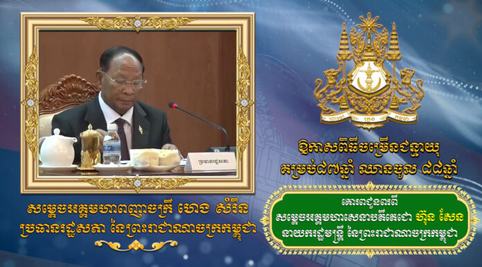 សារលិខិតជូនពរ សម្តេចអគ្គមហាសេនាបតីតេជោ ហ៊ុន សែន នាយករដ្ឋមន្រ្តី ជូនសម្តេចអគ្គមហាពញាចក្រី ហេង សំរិន ប្រធានរដ្ឋសភា នៃព្រះរាជាណាចក្រកម្ពុជា ក្នុងឱកាសពិធីចម្រើនជន្មាយុគម្រប់៨៧ឆ្នាំ ឈានចូល ៨៨ឆ្នាំ