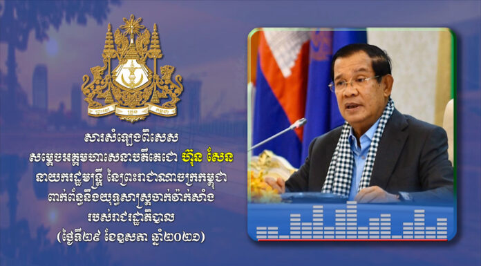សារសំឡេងពិសេស សម្តេចអគ្គមហាសេនាបតីតេជោ ហ៊ុន សែន នាយករដ្ឋមន្រ្តី នៃព្រះរាជាណាចក្រកម្ពុជា ពាក់ព័ន្ធនឹងយុទ្ធសាស្ត្រចាក់វ៉ាក់សាំងរបស់រាជរដ្ឋាភិបាល (ថ្ងៃទី២៩ ខែឧសភា ឆ្នាំ២០២១)