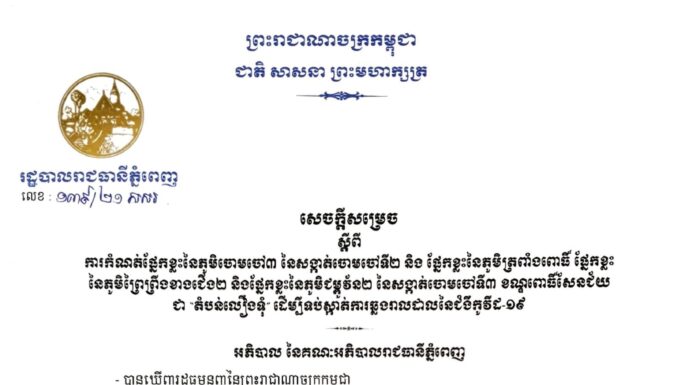 អភិបាលរាជធានីភ្នំពេញលោក ឃួង ស្រេង បានចេញសេចក្ដីសម្រេចបិទបញ្ចប់បំរាមគោចរ និងការអនុញ្ញាតគោលការណ៍ពិសេស ចំពោះអាជីវកម្មដ្ឋានមួយចំនួនក្នុង «តំបន់លឿង» នៃភូមិសាស្ដ្ររាជធានីភ្នំពេញ គិតចាប់ពីម៉ោងសូន្យថ្ងៃទី២២ ខែឧសភា ឆ្នាំ២០២១នេះតទៅ។
