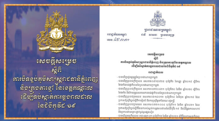 សេចក្តីសម្រចរបស់រាជរដ្ឋភិបាល ស្តីពី ការបិទខ្ទប់ភូមិសាស្រ្តរាជធានីភ្នំពេញ និងក្រុងតាខ្មៅ នៃខេត្តកណ្តាល ដើម្បីទប់ស្កាត់ការឆ្លងរាលដាលនៃជំងឺកូវីដ-១៩