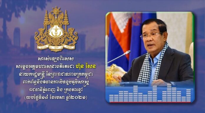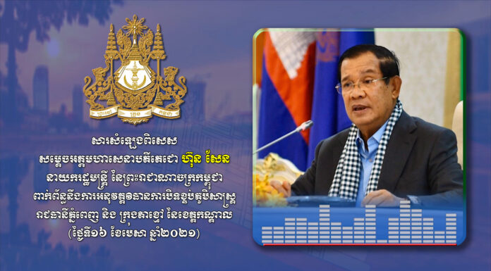 សម្ដេចតេជោ ហ៊ុន សែន នាយករដ្ឋមន្ដ្រីនៃកម្ពុជា នៅវេលាម៉ោង៩ព្រឹកថ្ងៃទី១០ ខែមេសា ឆ្នាំ២០២១នេះ បានថ្លែងសារពិសេសជូនជនរួមជាតិ ពាក់ព័ន្ធស្ថានភាពជំងឺកូវីដ១៩ នៅក្នុងប្រទេសកម្ពុជា