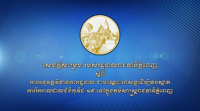 រដ្ឋបាលរាជធានីភ្នំពេញ សម្រេចអនុវត្តវិធានការរដ្ឋបាលដើម្បីទប់ស្កាត់ការរីករាលដាលជំងឺកូវីដ១៩ នៅក្នុងភូមិសាស្ត្ររាជធានីភ្នំពេញ ដោយផ្អាកការចរាចរ រួមទាំងសកម្មភាពអាជីវកម្ម ការប្រមូលផ្តុំនានា នៅភូមិសាស្រ្តរាជធានីភ្នំពេញ នាពេលយប់ ចាប់ពីម៉ោង៨យប់ ដល់ម៉ោង៥ព្រឹក រយៈពេល២សប្តាហ៍ គិតចាប់ពីថ្ងៃទី០១-១៤ មេសា ២០២១។