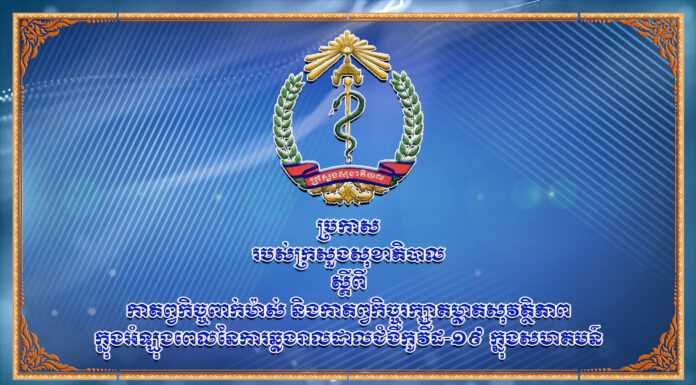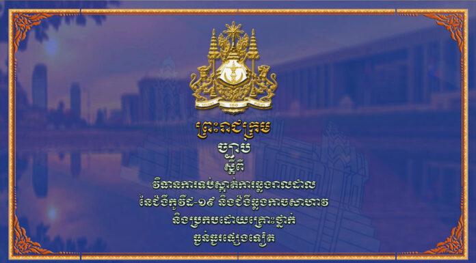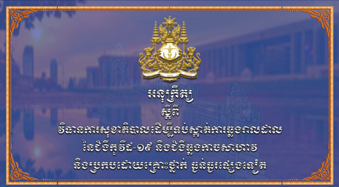រាជរដ្ឋាភិបាលកម្ពុជាបានចេញ អនុក្រឹត្យ ស្តីពីវិធានការសុខាភិបាលដើម្បីទប់ស្កាត់ការឆ្លងរាលដាលនៃជំងឺកូវីដ១៩ និងជំងឺឆ្លងកាចសាហាវ និងប្រកបដោយគ្រោះថ្នាក់ធ្ងន់ធ្ងរផ្សេងទៀត