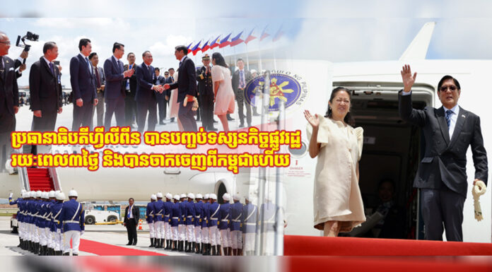 លោក Ferdinand Romualdez Marcos Jr. ប្រធានាធិបតីហ្វីលីពីន និងជំទាវទី១ហ្វីលីពីន បានបញ្ចប់ដំណើរទស្សនកិច្ចផ្លូវរដ្ឋរយៈពេល៣ថ្ងៃ នៅកម្ពុជាហើយ ដោយលោកបានចាកចេញពីកម្ពុជា នៅព្រឹកថ្ងៃទី០៩ ខែកញ្ញា ឆ្នាំ២០២៥នេះ។