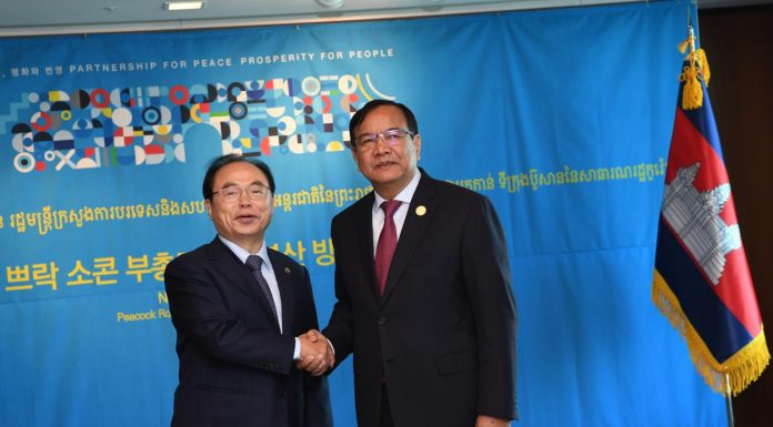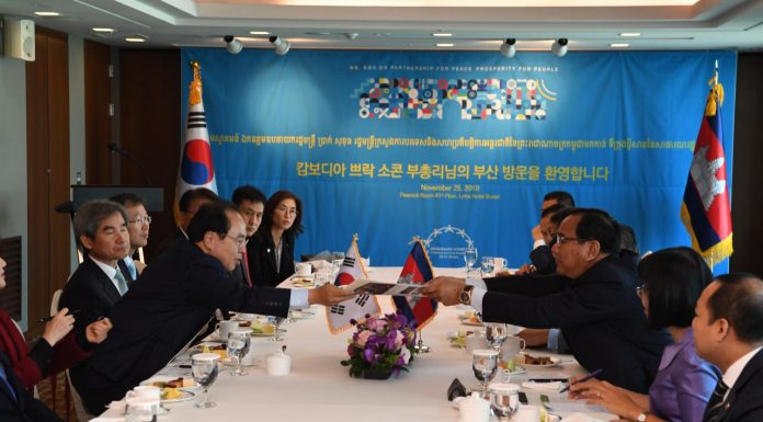 ឯកឧត្តមឧបនាយករដ្ឋមន្រ្តី ប្រាក់ សុខុន រដ្ឋមន្រ្តីក្រសួងការបរទេស និងសហប្រតិបត្តិការអន្តរជាតិ អញ្ជើញជួបពិភាក្សា ការងារជាមួយ ឯកឧត្តម OH Kea Don អភិបាលក្រុងប៊ូសាន នៃសាធារណរដ្ឋកូរ៉េ នាព្រឹកថ្ងៃទី២៥ ខែវិច្ឆិកា ឆ្នាំ២០១៩ ខណៈឯកឧត្តមឧបនាយករដ្ឋមន្រ្