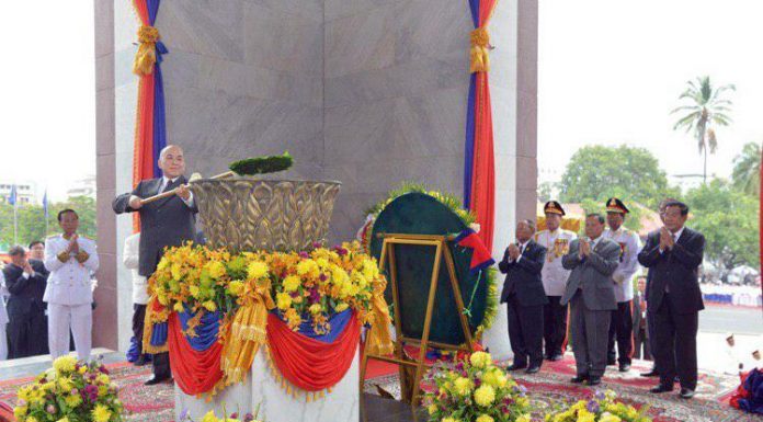 ឯកឧត្តមកិតិ្តនីតិកោសលបណ្ឌិត ប៊ិន ឈិន ឧបនាយករដ្ឋមន្រ្តីប្រចាំការ រដ្ឋមន្រ្តីទទួលបន្ទុកទីស្តីការគណៈរដ្ឋមន្រ្តី និងមន្ត្រីរាជការក្រោមឱវាទ បានអញ្ជើញដង្ហែព្រះករុណាព្រះបាទសម្ដេចព្រះបរមនាថ នរោត្ដម សីហមុនី ព្រះមហាក្សត្រនៃព្រះរាជាណាចក្រកម្ពុជា យាងពន្លត់ភ្លើងជ័យ នៅវិមានឯករាជ្យ