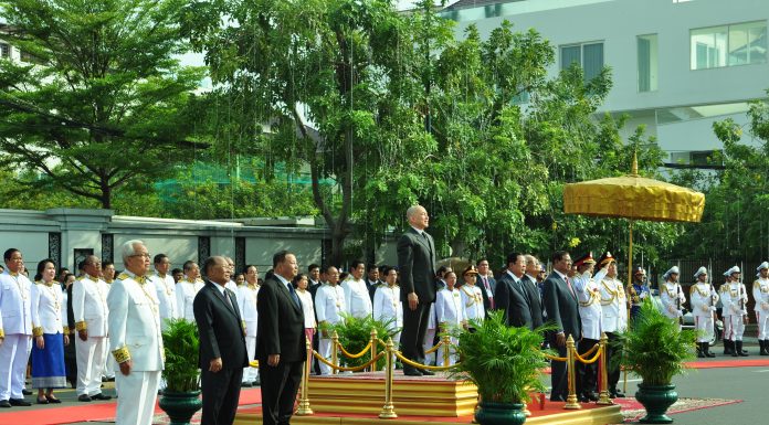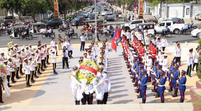 ព្រះករុណា ព្រះបាទសម្តេចព្រះបរមនាថ នរោត្តម សីហមុនី ព្រះមហាក្សត្រ នៃព្រះរាជាណាចក្រកម្ពុជា អមព្រះរាជដំណើរដោយប្រមុខថ្នាក់ដឹកនាំជាន់ខ្ពស់ ស្តេចយាងប្រទានភ្លើងជ័យ នៅវិមានឯករាជ្យ អបអរសាទរខួបលើកទី៦៦ ថ្ងៃបុណ្យឯករាជ្យជាតិ